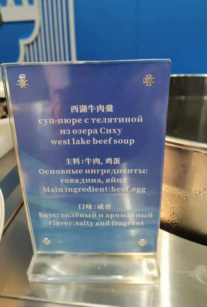 当天提供的午餐一共有两道羹汤,一道是偏西式的奶油黄瓜浓汤,另一道就是“中式代表”,浙江杭州菜系中比较经典的西湖牛肉羹。