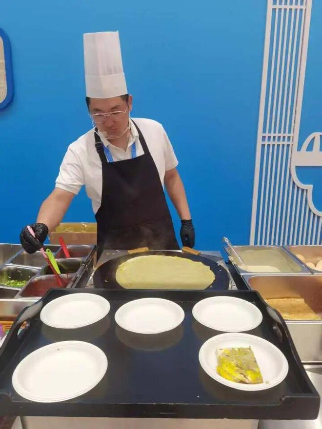 每一餐的菜单都很丰富,沙拉、主菜、水果、羹汤、主食、小吃点心、饮料等都有多种不同选择,现场还设置了“明档”,现做的天津特色的煎饼果子、现煮的水饺、馄饨等各种中式点心档口前总是有排队等候的人。